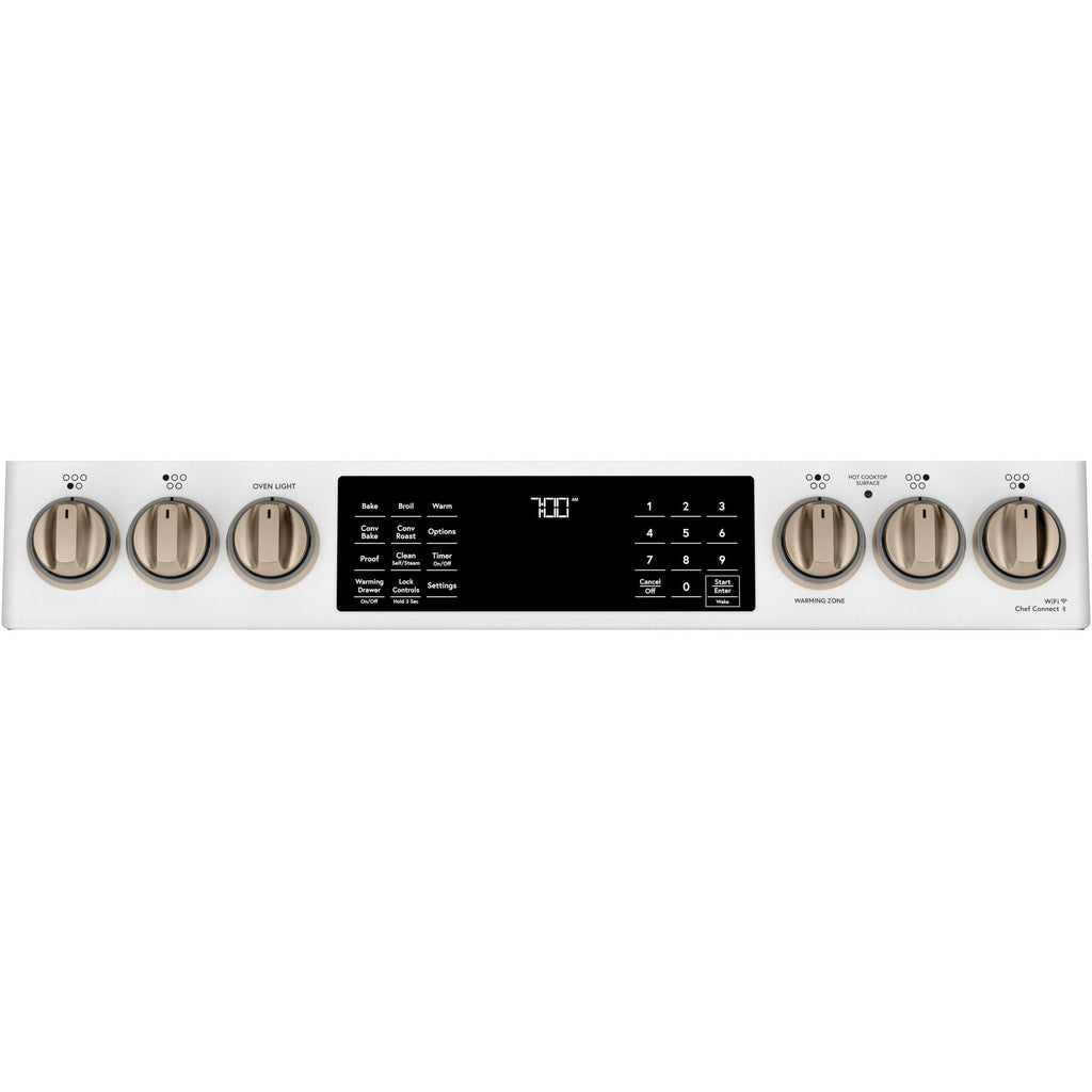 This 30-inch Café™ slide-in electric range features True European Convection with precise air, temperature probe, Wi-Fi Connect and a 5.7... This 30-inch Café™ slide-in electric range features True European Convection with precise air, temperature probe, Wi-Fi Connect and a 5.7 cu.ft. oven capacity. View more