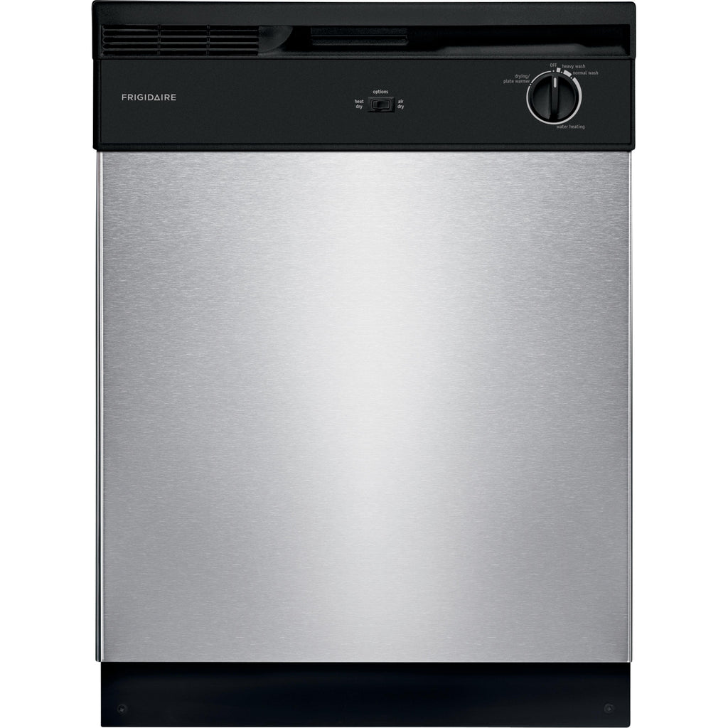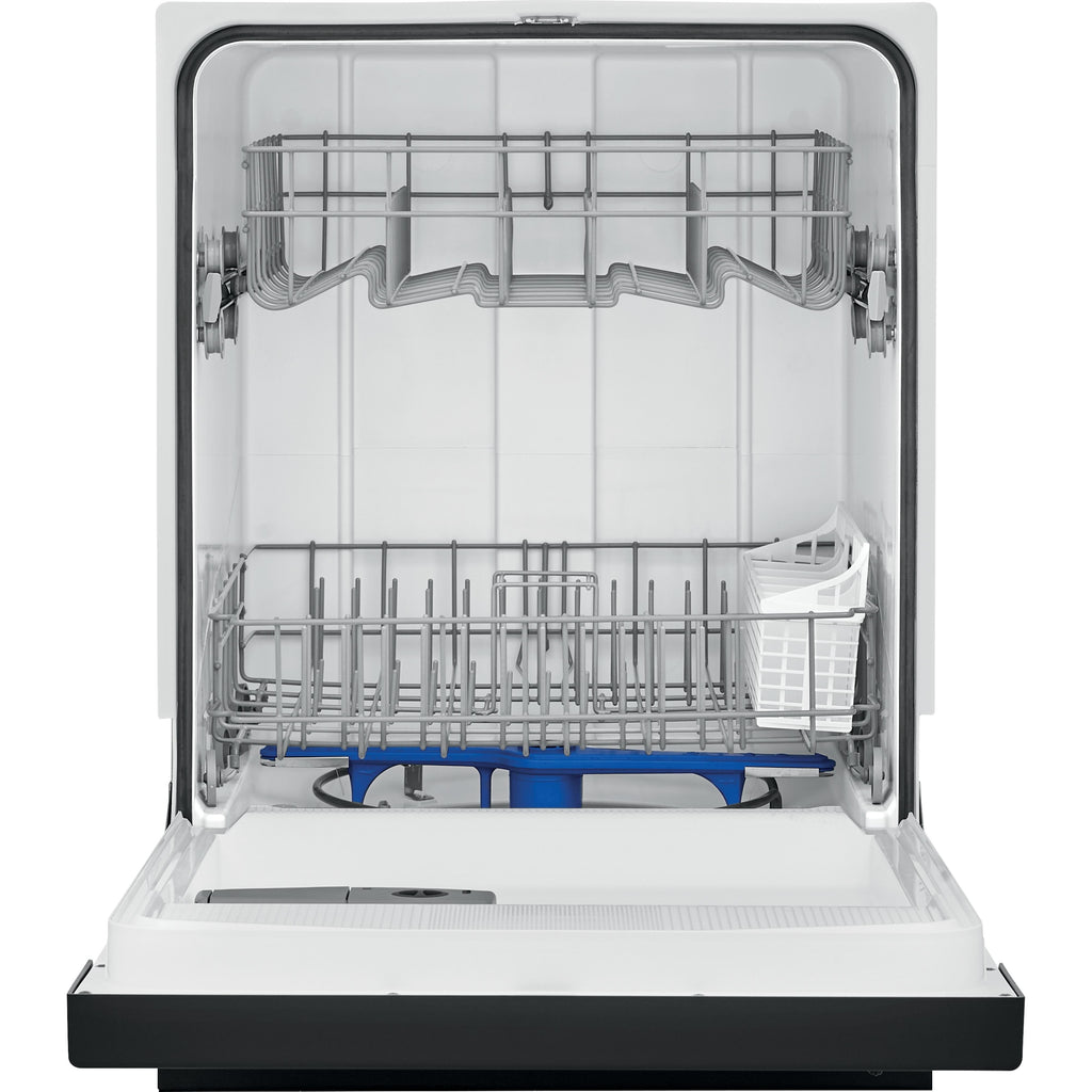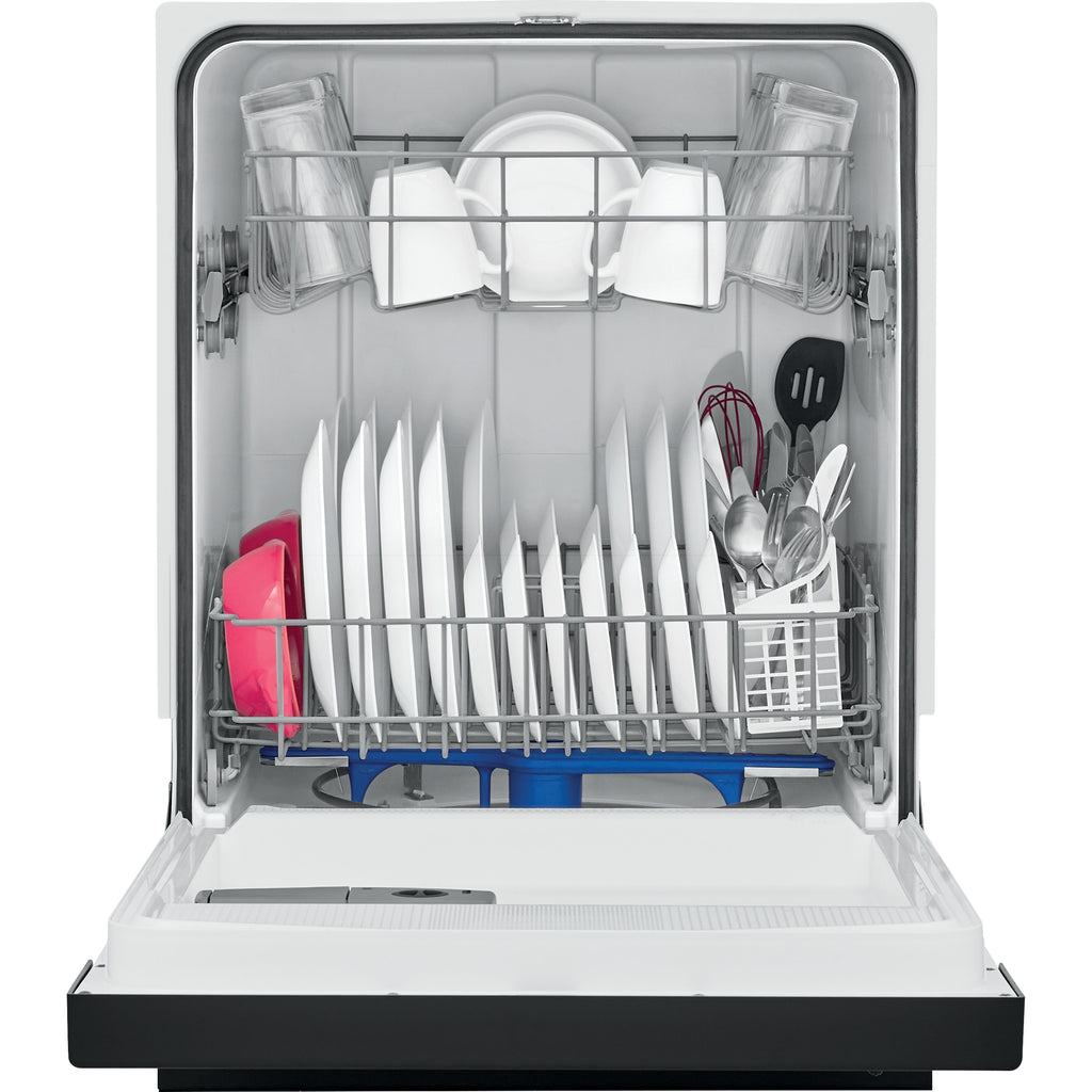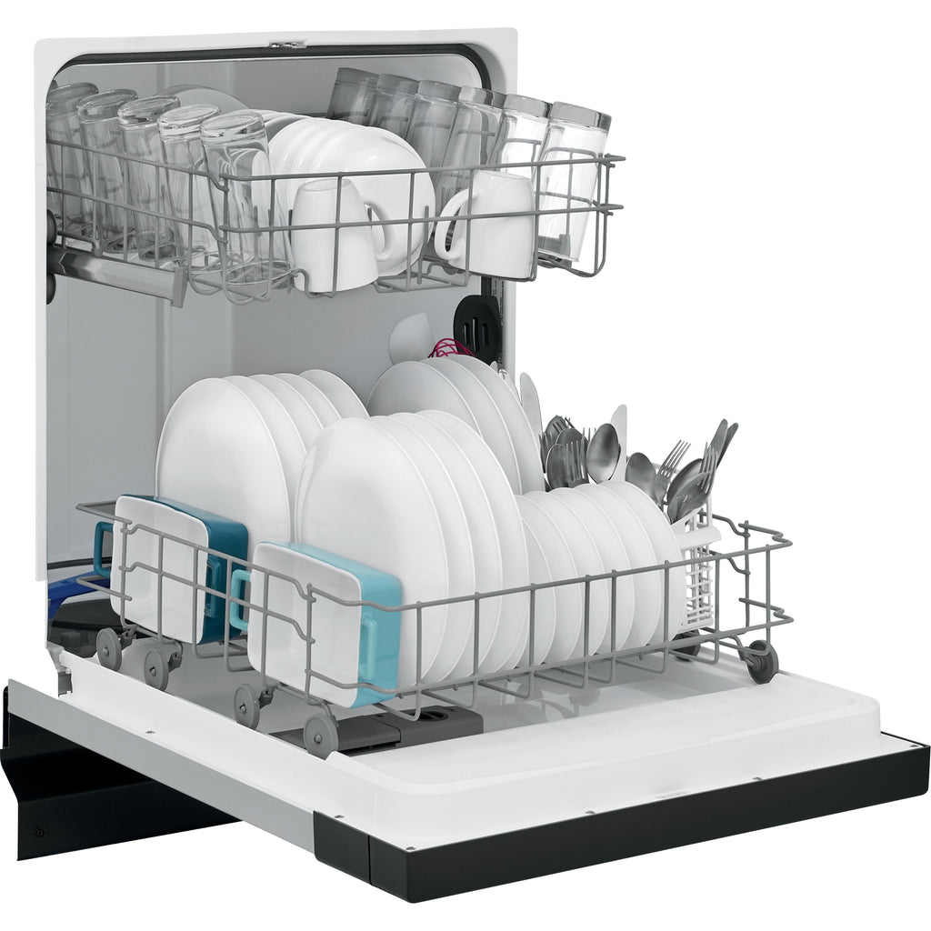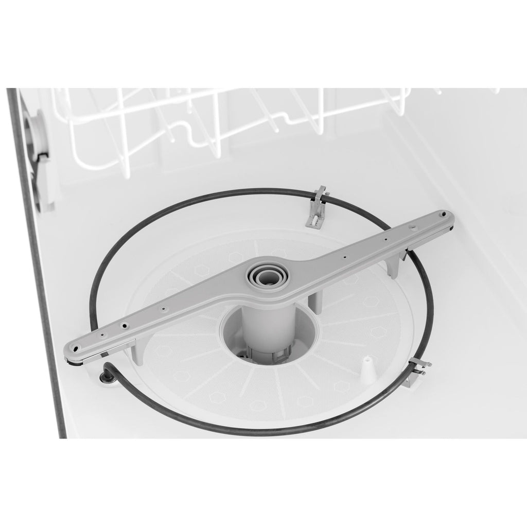 Self-cleaning filter eliminates food particles, keeping dishes clean.