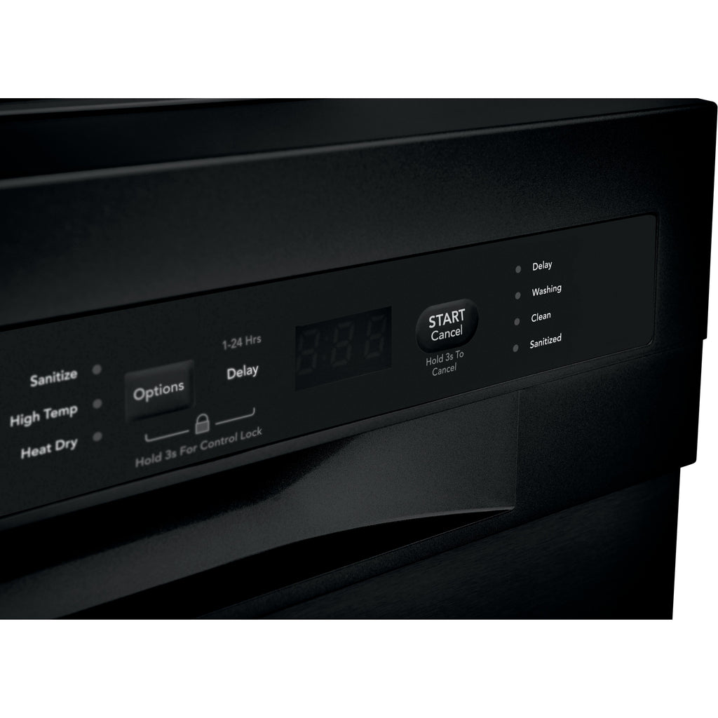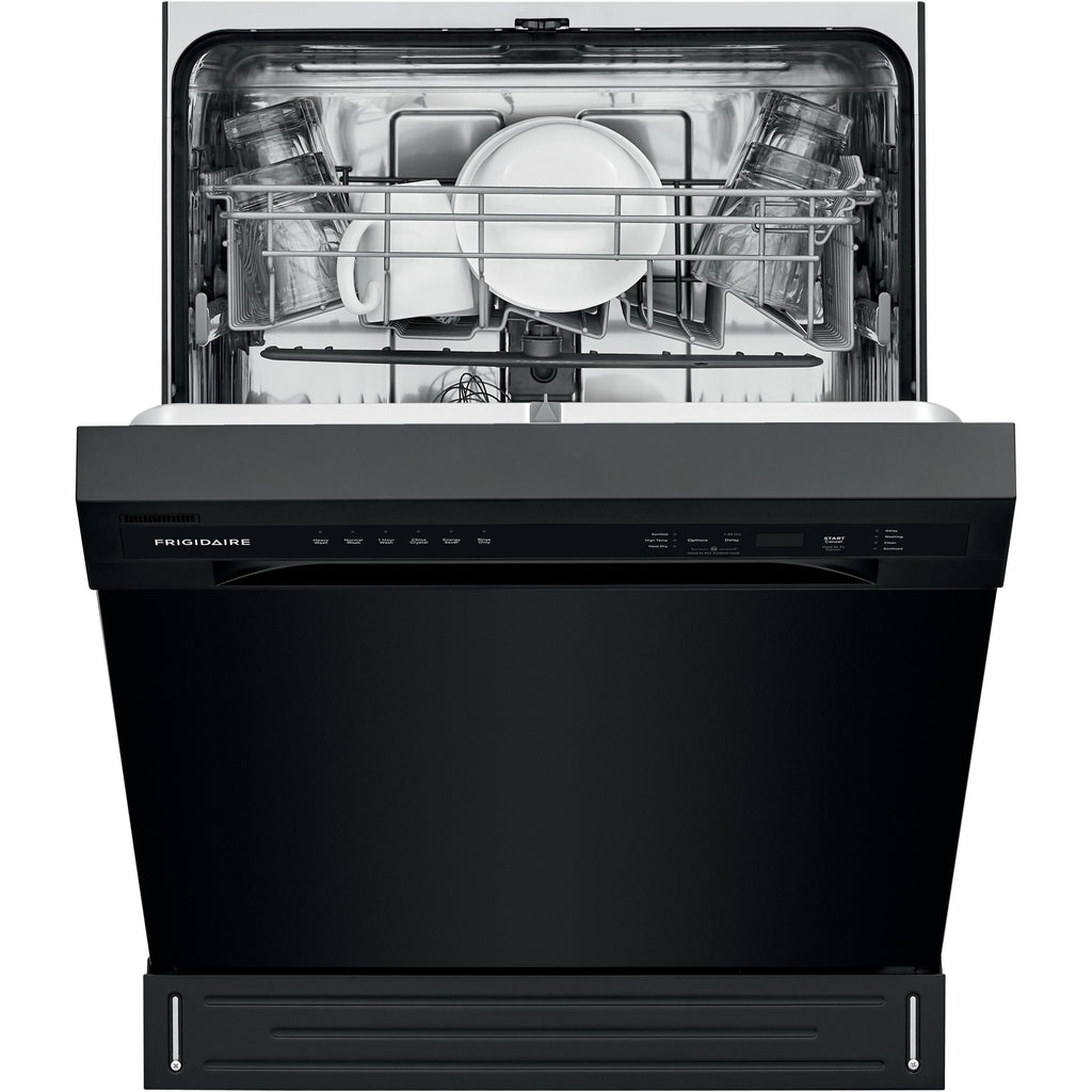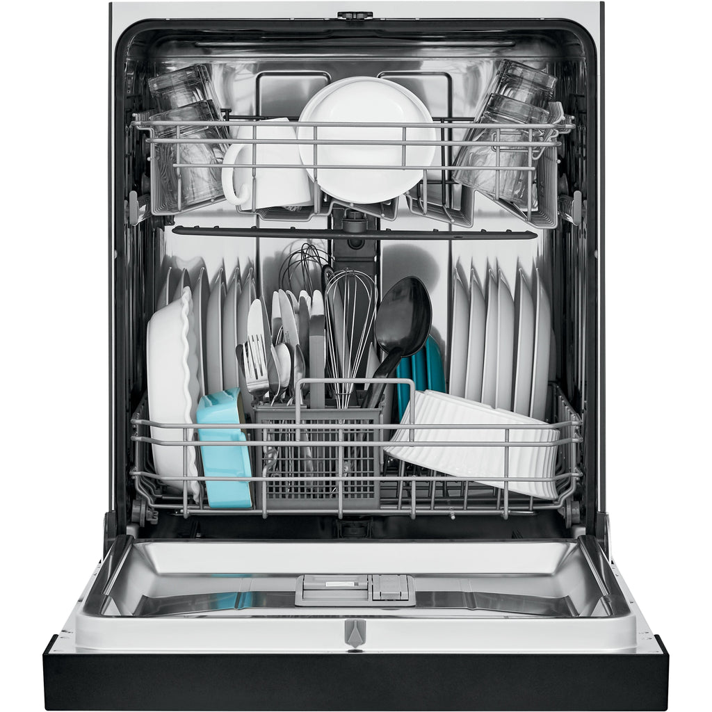 Self-cleaning filter eliminates food particles, keeping dishes clean.