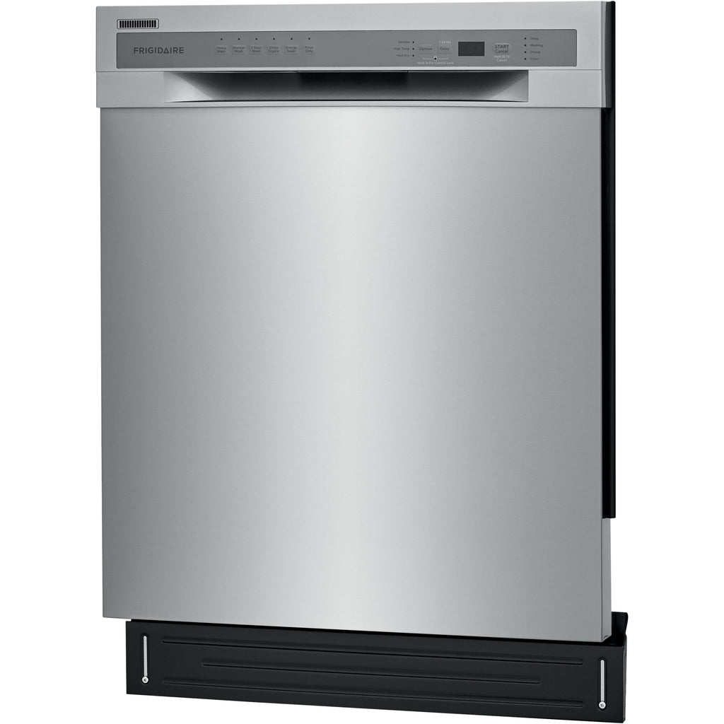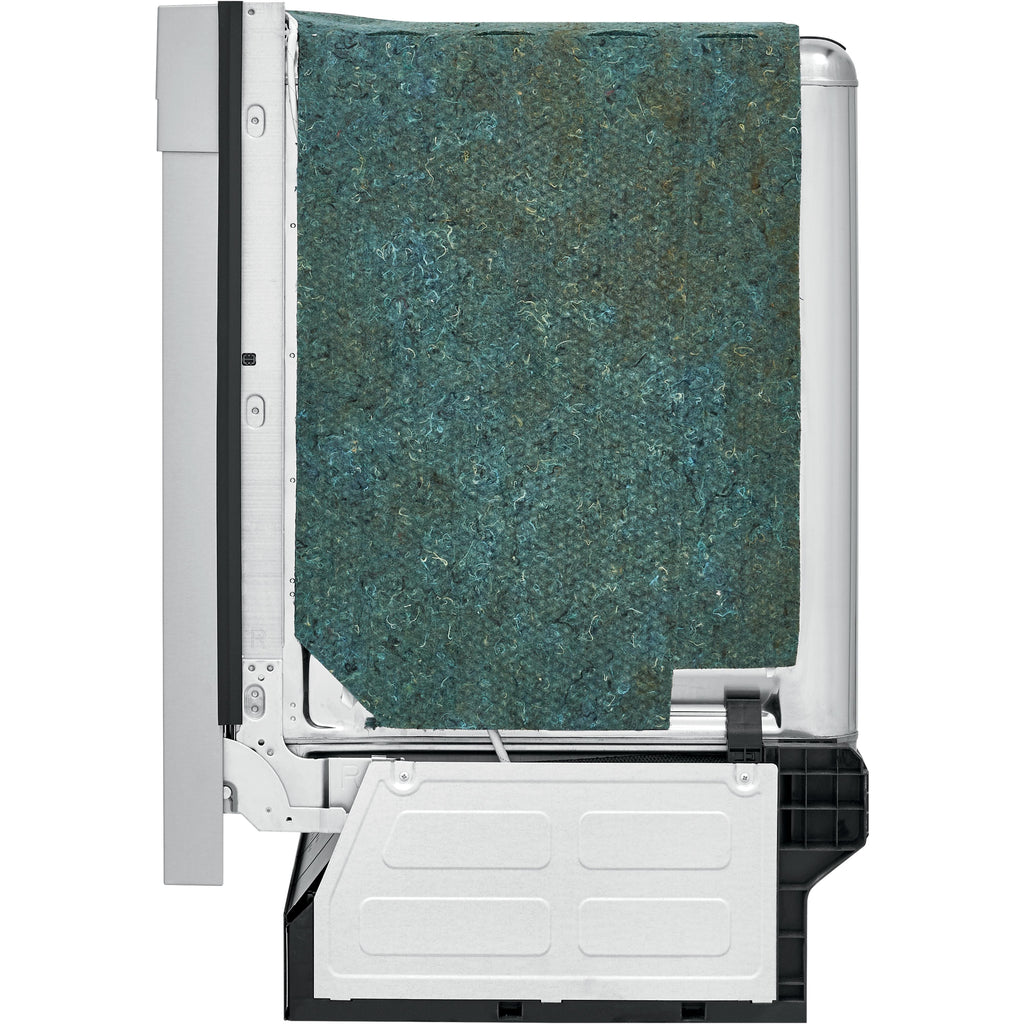 Self-cleaning filter eliminates food particles, keeping dishes clean.