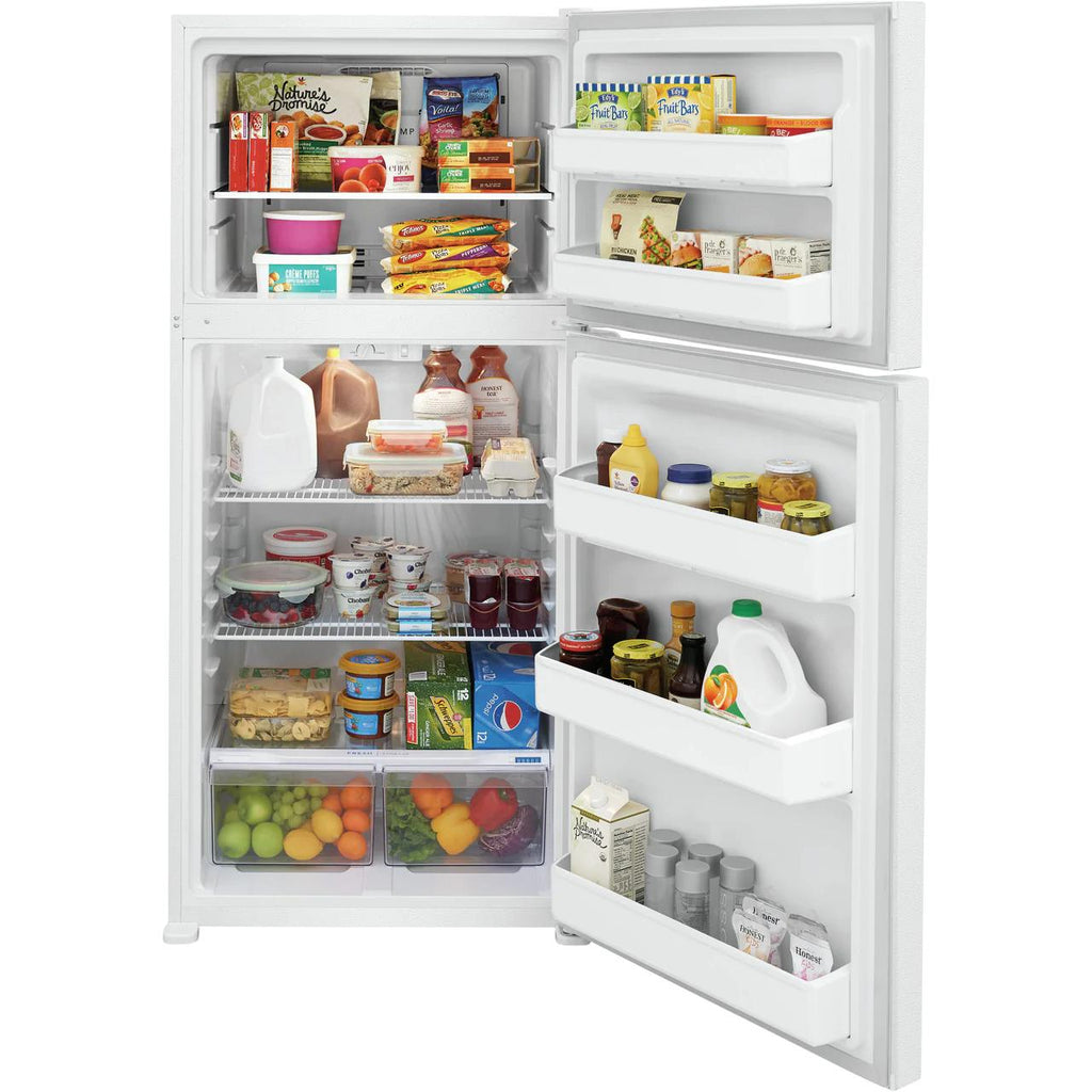 Find a place for everything with our spacious interior storage options designed for busy families, including 2 wire shelves, generous door bins, and a full-width glass freezer shelf.