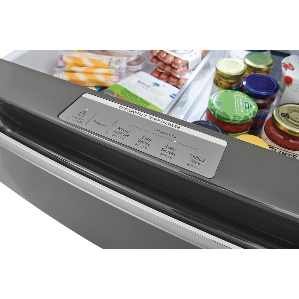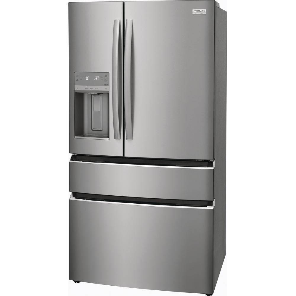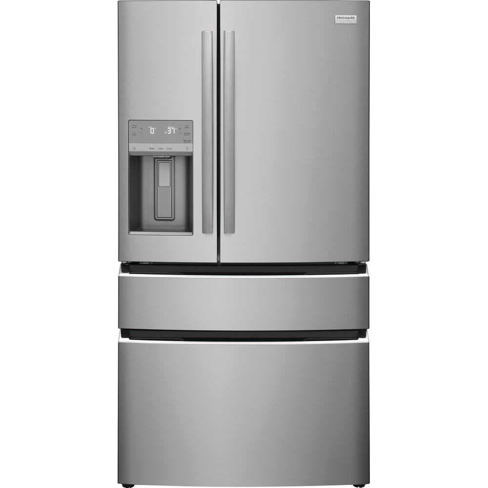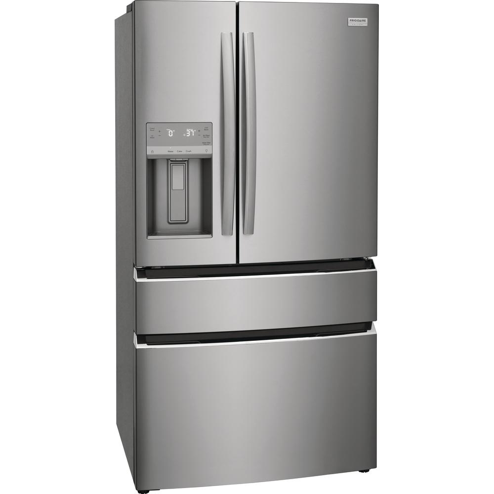 Frigidaire Gallery 4-door refrigerator features a digital temperature display, external water and ice dispenser, and clear door bins.