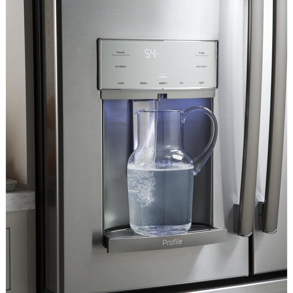 GE Profile 36-inch, 22.2 cu.ft. Counter-Depth French 3-Door Refrigerator with Water and Ice Dispensing System PYE22KSKSS