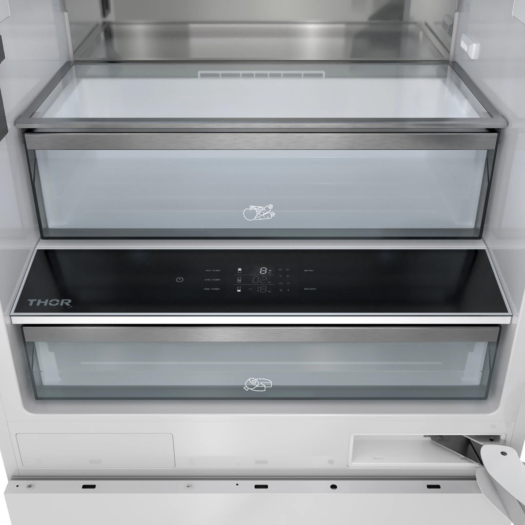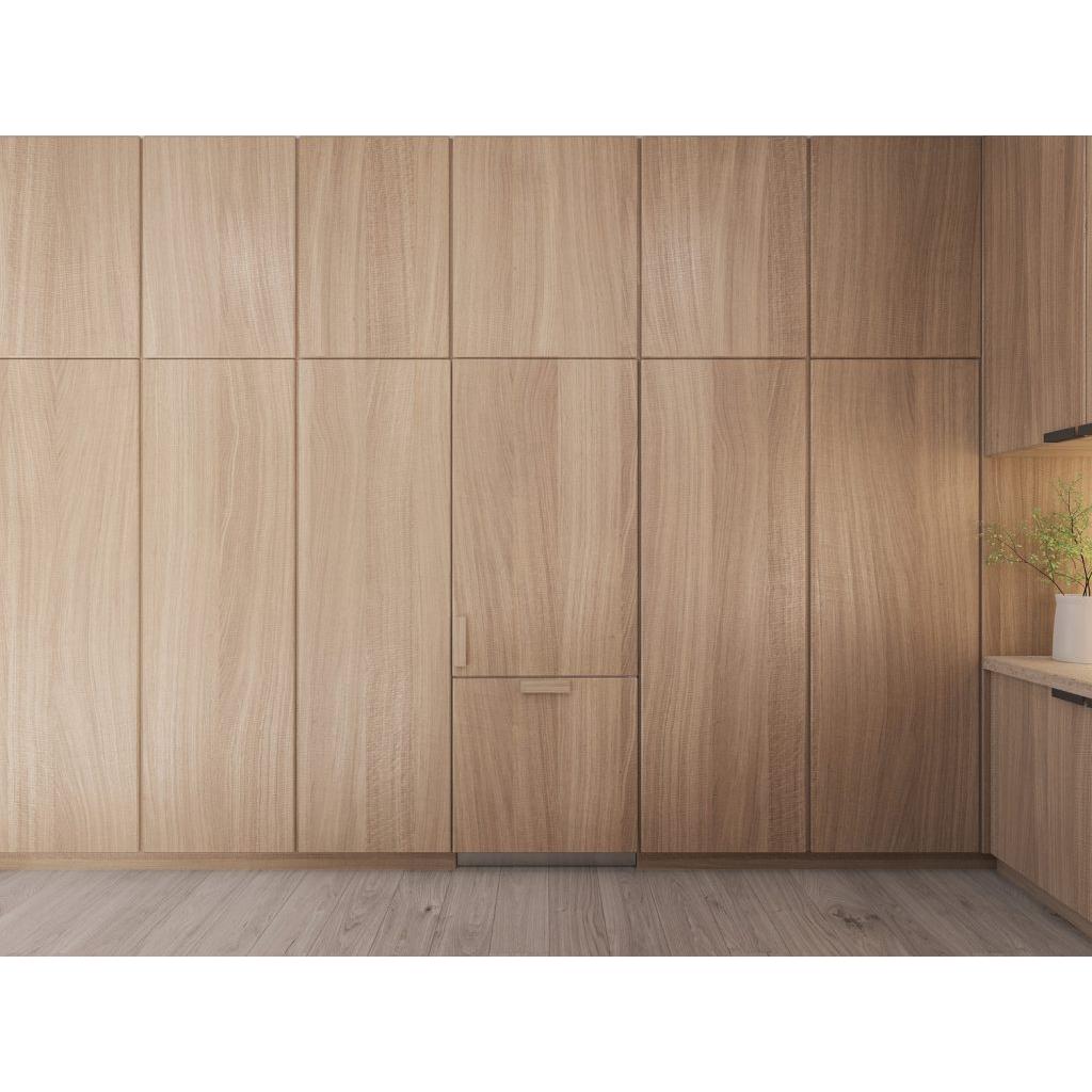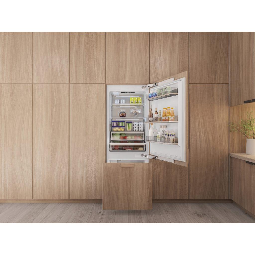 A refrigerator with a 90-degree opening flush hinge, allowing for seamless installation that aligns perfectly with surrounding cabinetry