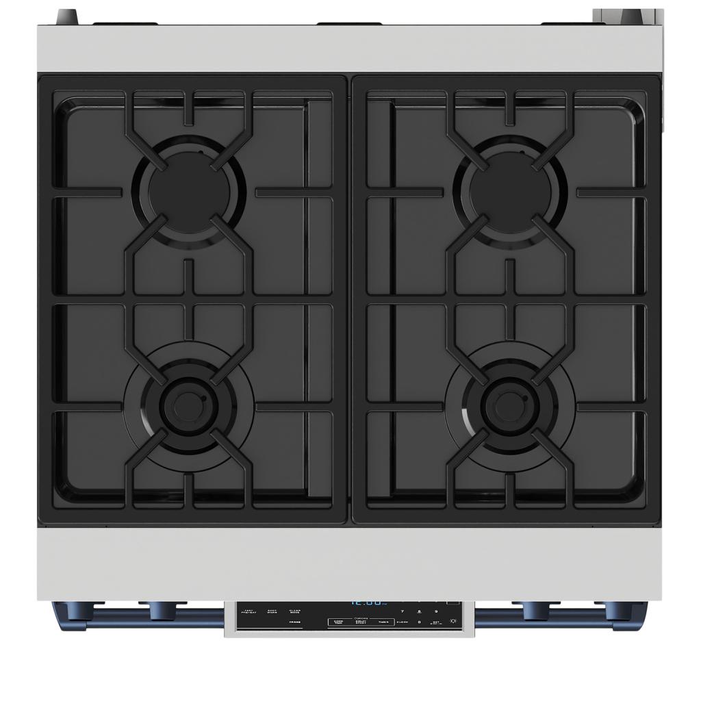The continuous grate design allows easy movement of pots and pans across the cooktop.