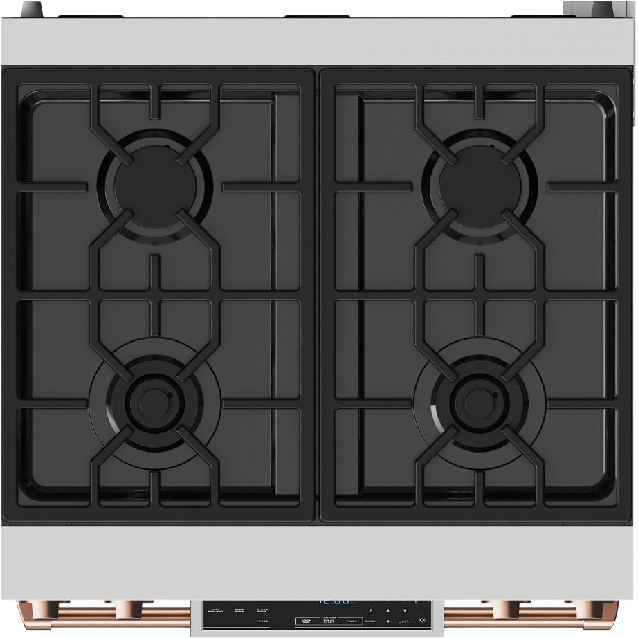 The continuous grate design allows easy movement of pots and pans across the cooktop.